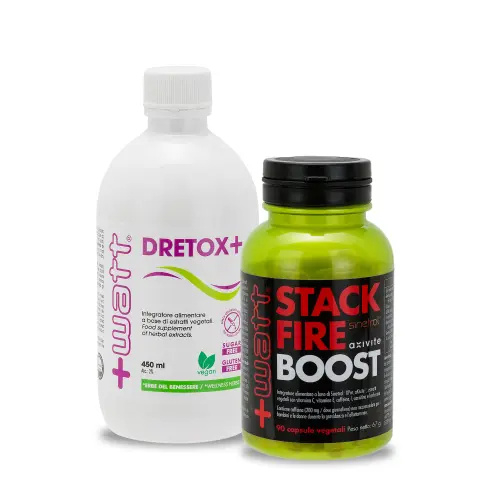 Avvertenze: Contiene caffeina (da Stack Fire Boost). Non raccomandato per bambini, donne in gravidanza o in allattamento. Non superare le dosi consigliate. Gli integratori non sostituiscono una dieta variata e uno stile di vita sano. Consultare il medico in caso di patologie o assunzione di farmaci. Dretox+ contiene ingredienti di origine vegetale: eventuali depositi o variazioni di colore non ne compromettono la qualità.