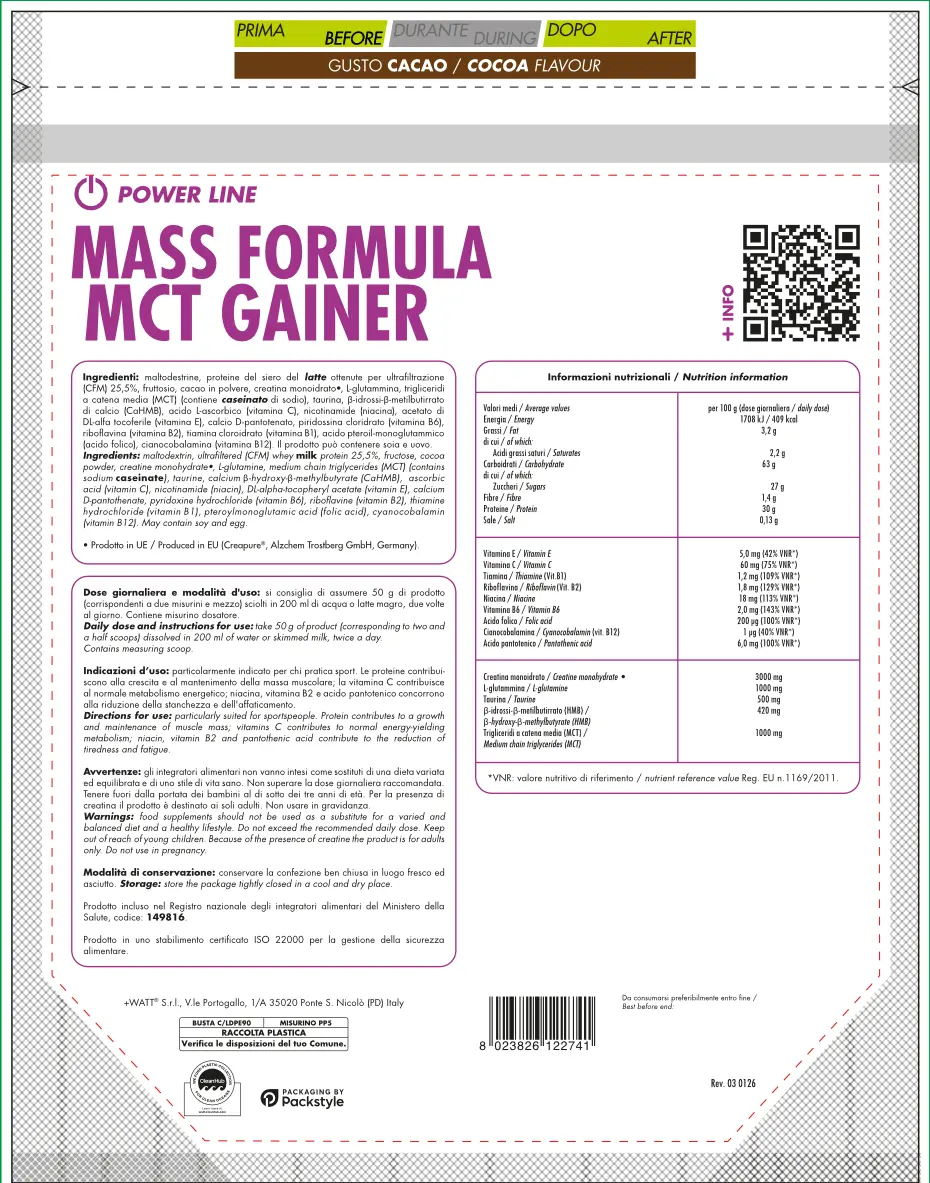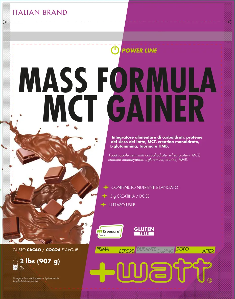 Mass formula MCT gainer è l’integratore progettato per chi necessita di un apporto calorico e proteico superiore per sostenere la crescita della massa muscolare. La sua formula bilanciata combina carboidrati a rilascio differenziato, proteine del siero del latte ad alto valore biologico e una selezione di ingredienti funzionali come HMB, MCT e creatina.